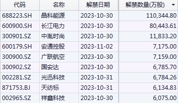 其他解禁数量较大的公司有晶科能源(11.03亿股)、长江电力(8.04亿股)、中胤时尚(1.18亿股)、安通控股(7175万股)、广联航空(7159万股)、国安达(6785.7万股)、光迅科技(6784.26万股)、天纺标(6134.83万股)等。