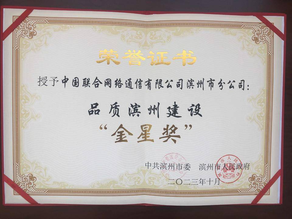 2023年10月23日,第五届滨州市企业家大会在滨州黄河三角洲交易中心召开,这是一年一度的滨州企业家盛会。滨州联通被授予品质滨州建设“金星奖”,这也是滨州联通连续五年荣获该奖项。