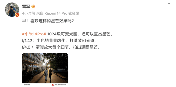 在今天一早,雷军就在微博询问网友喜欢这样的星芒效果吗?并表示该光圈可直出星芒效果,并且在f/1.42时背景虚化效果更明显,在f/4.0时成像更为清晰锐利。