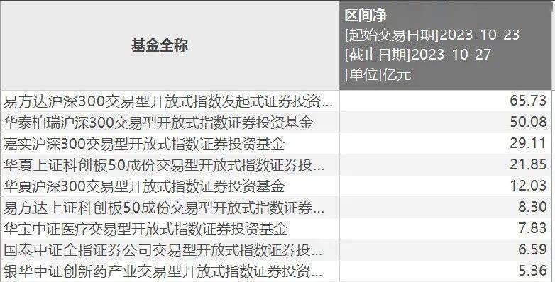 据测算,在10月23日至10月27日的一周内,易方达沪深300ETF、华泰柏瑞沪深300ETF、嘉实沪深300ETF、华夏上证科创板50成份ETF、华夏沪深300ETF等宽基ETF合计净申购额超过170亿元。