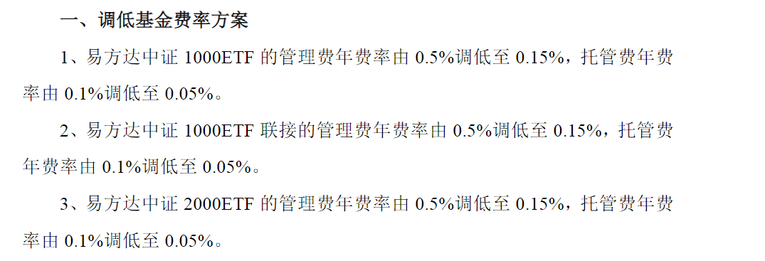 例如,10月28日,易方达基金公告称,自10月30日起,调低旗下中证1000ETF、中证1000ETF联接、中证2000ETF的管理费率及托管费率。具体来看,易方达中证1000ETF的管理费年费率由0.5%调低至0.15%,托管费年费率由0.1%调低至0.05%;易方达中证1000ETF联接的管理费年费率由0.5%调低至0.15%,托管费年费率由0.1%调低至0.05%;易方达中证2000ETF的管理费年费率由0.5%调低至0.15%,托管费年费率由0.1%调低至0.05%。