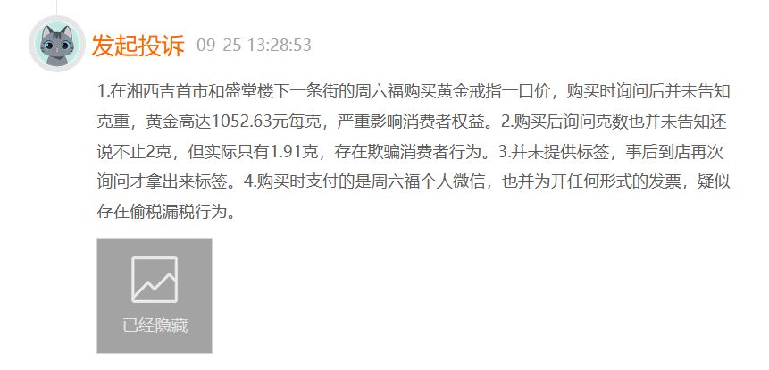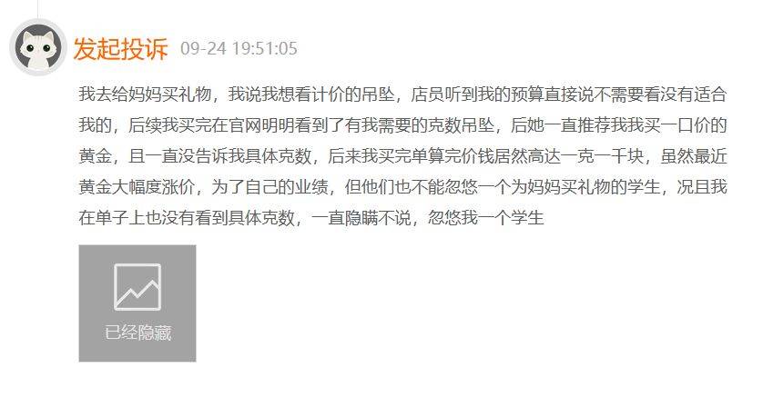 投诉者的反馈主要集中在诱导购买一口价产品、不告知一口价金饰克重、不开具发票、金饰质量问题等。