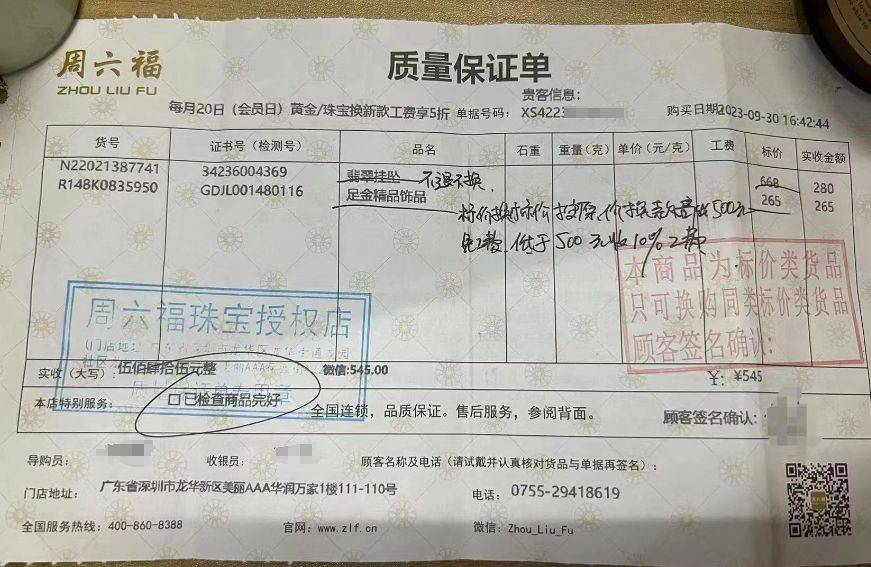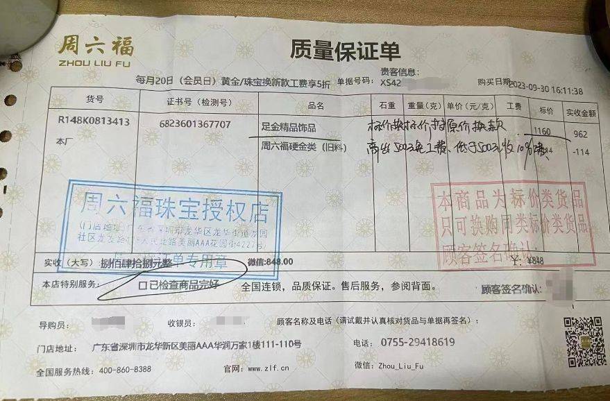 他向记者表示,今年7月底和9月底他分别两次到周六福门店购买黄金饰品。期间他完全不知道所购黄金饰品的克重。一是店员没有为其称重,产品标签被其收走;二是门店提供的质量保证单没有列明产品对应的克重。