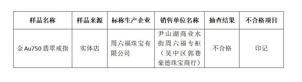 过去三年,周六福的产品有过一次不合格抽查记录。2022年10月,苏州市市场监督管理局发布2022年珠宝贵金属饰品产品质量市级监督抽查情况公告(第36期)。标称生产企业为“周六福珠宝有限公司”的1款“金Au750翡翠戒指”在印记项目中不合格。