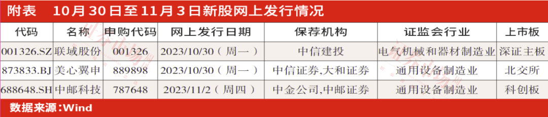 根据新股发行安排,即将于下周(10月30日至11月3日)进行网上申购的新股共有3只,分别为联域股份、美心翼申和中邮科技(详见附表),在3只新股中,联域股份拟登陆深证主板,属于电气机械和器材制造业,后两家公司则分别拟登陆北交所和科创板,均属于通用设备制造业。