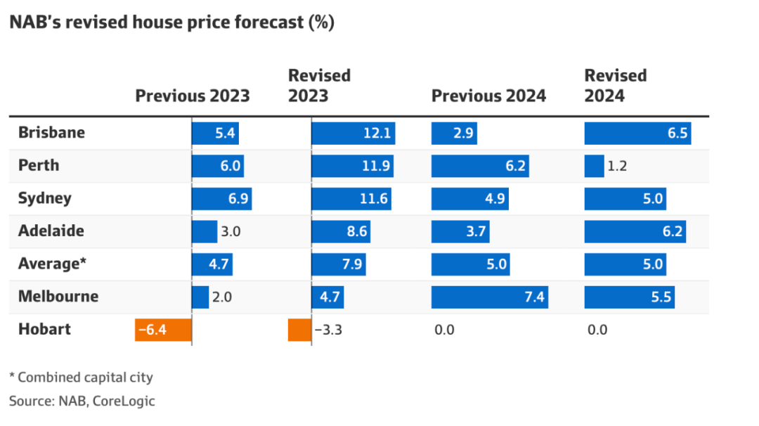 相比而言,七月时NAB预测悉尼房价会增长7%,墨尔本增长2%,布里斯班增长5.4%,