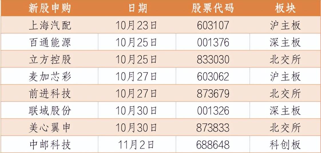 本周,A股共有上海汽配、百通能源、麦加芯彩等五只新股申购,下周暂定有联域股份、美心翼申、中邮科技三只新股进行申购。