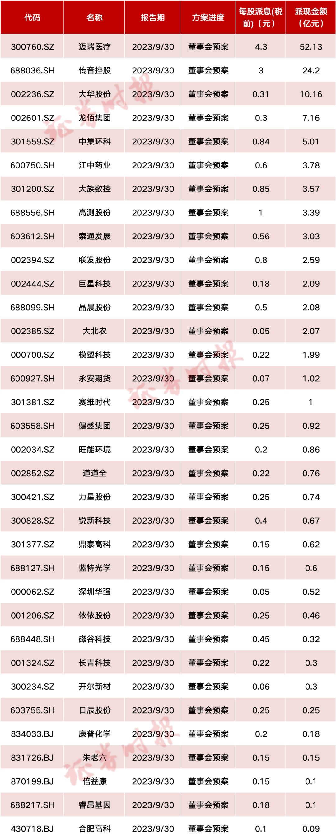 数据显示,截至目前,迈瑞医疗、传音控股、大华股份等三季报拟派现金额居前,分别为52.13亿元、24.20亿元、10.16亿元。