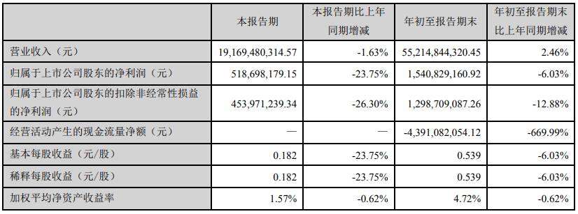 第三季度,紫光营业收入 191.69 亿元,同比减少 1.63%;归母净利润 5.19 亿元,同比减少 23.75%。