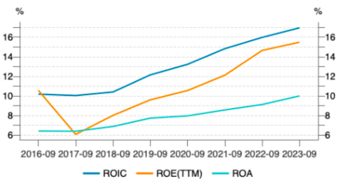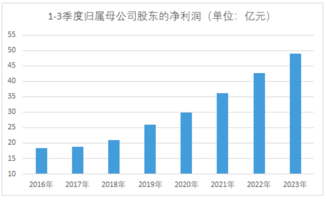 今年前三季度,该公司营业收入实现309.78亿元,同比增长6.42%。同期,公司归母净利润达49.08亿元,同比增长15.02%。而从2016年开始,该公司各年三季报归母净利润均呈正向增长,至今已延续8年时间。