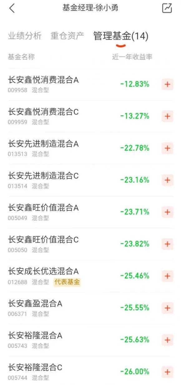 目前,他一共管理了7只基金,在管产品规模为31.40亿元人民币。值得注意的是,这7只基金全部为中高风险等级的混合类产品。而他所管理的这些权益类基金近一年内收益率全部为负。同花顺数据显示,徐小勇旗下产品亏损最少的为长安鑫悦消费混合A,该产品近一年收益率为-12.83%,其他产品近一年收益率亏损均在20%以上。