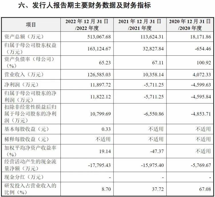 2020年-2022年(以下简称“报告期”),公司的产品开始逐步实现较为成熟的商业化应用,营业收入分别为4072.33万元、1.04亿元和12.66亿元,复合增长率高达457.53%;同期归母净利润分别为-4595.84万元、-5711.25万元和1.18亿元。2022年开始扭亏为盈。