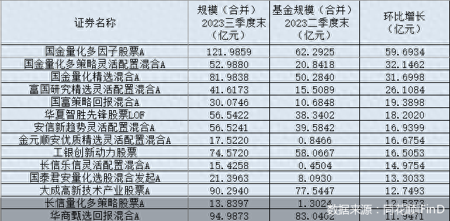 除上述3只产品外,还有富国研究精选灵活配置混合、国富策略回报灵活配置混合、华夏智胜先锋股票(LOF)、安信新趋势灵活配置混合、金元顺安优质精选灵活配置混合、工银创新动力股票、长信乐信灵活配置混合、国泰君安量化选股混合发起式、大成高新技术产业股票、长信量化多策略股票、华商甄选回报混合等11只产品的三季度末规模环比二季度末增长超10亿元。