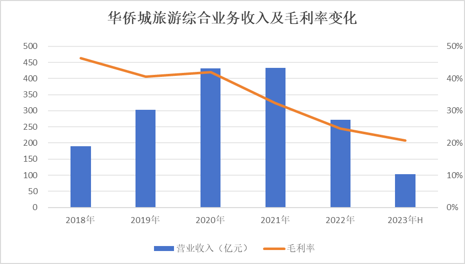 业绩层面则显示,疫情三年华侨城的旅游综合业务分别贡献收入432.10亿元、433.17亿元、272.20亿元,其中去年该业务收入同比减少37.16%,相当于2019年同期不足90%;毛利率自2020年之后跌破40%关口,至去年仅有24.47%。