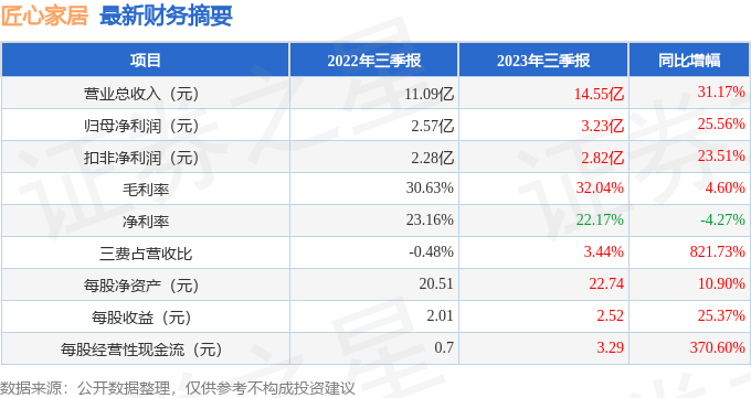 据证券之星公开数据整理,近期匠心家居(301061)发布2023年三季报。根据财报显示,本报告期中匠心家居营收净利润同比双双增长,三费占比上升明显。截至本报告期末,公司营业总收入14.55亿元,同比上升31.17%,归母净利润3.23亿元,同比上升25.56%。按单季度数据看,第三季度营业总收入5.09亿元,同比上升55.83%,第三季度归母净利润1.21亿元,同比上升43.85%。