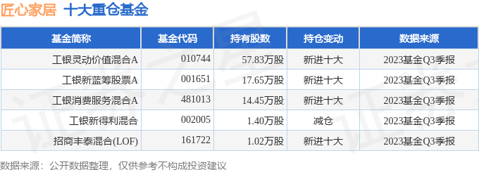 持有匠心家居最多的基金为工银灵动价值混合A,目前规模为9.55亿元,最新净值0.7934(10月27日),较上一交易日上涨1.59%,近一年上涨0.3%。该基金现任基金经理为王筱苓 陈小鹭。