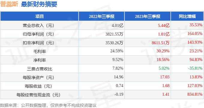据证券之星公开数据整理,近期普蕊斯(301257)发布2023年三季报。根据财报显示,本报告期中普蕊斯营收净利润同比双双增长,盈利能力上升。截至本报告期末,公司营业总收入5.44亿元,同比上升35.53%,归母净利润1.01亿元,同比上升164.05%。按单季度数据看,第三季度营业总收入1.95亿元,同比上升25.07%,第三季度归母净利润3896.86万元,同比上升107.39%。
