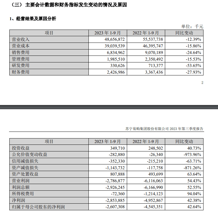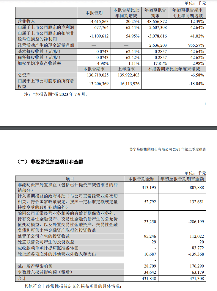 苏宁易购 2023 年第三季度营收为 146.16 亿元,同比降 20.25%;净亏损为 6.78 亿元,扣非后净亏损为 11.1 亿元。