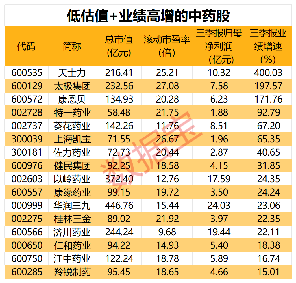 数据宝统计,A股中药板块有73股,东阿阿胶、太极集团、达仁堂、马应龙等29股滚动市盈率不足30倍,济川药业、吉林敖东更是不足10倍,吉林敖东以8.16倍的市盈率,成为估值最低的中药股。