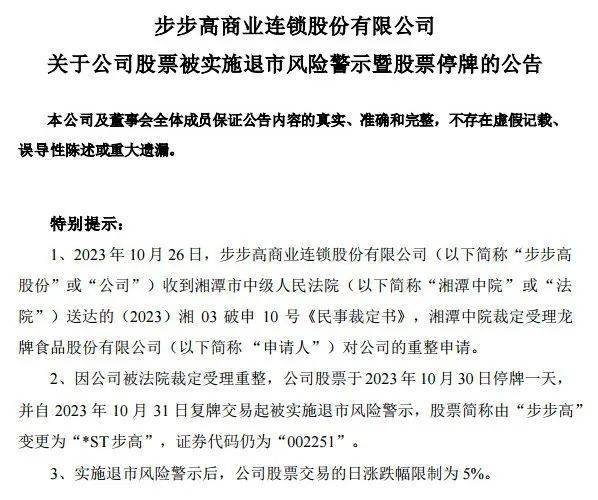 10月29日晚间,步步高公告称,公司收到湘潭中院送达的《民事裁定书》,湘潭中院裁定受理龙牌食品股份有限公司对公司的重整申请。因公司被法院裁定受理重整,根据规定,公司股票将于10月30日停牌一天,并自10月31日复牌交易起被实施退市风险警示,股票简称改为“*ST步高”,股票价格日涨跌幅限制为5%。