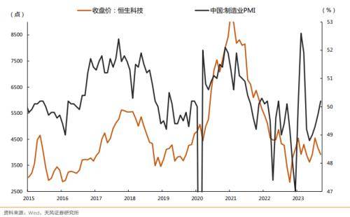 历史上看,除了 14-15 年的杠杠牛以外,沪深 300 和恒生科技的中期趋势还是由 PMI 决定, 背后是中国经济的基本面;两个指数的主要权重是食品饮料、金融、互联网龙头,这些板 块的基本面或者估值运行趋势都依赖于中国经济的β。