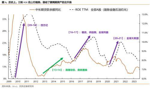 (2)两段经济复苏主升浪 16-17 年和 20-21 年(最终 ROE 形成上行趋势):两段复苏主升浪,前者是棚改货币化、后者是全球大刺激。而这两次主升浪的过程中,美债利率都是 上行趋势。第一次主升浪美联储在收缩,于是指数上行的斜率比较缓和。第二次主升浪美 联储在大放水,于是指数上行的斜率比较陡峭。