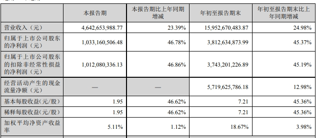 报告显示,前三季度实现营收159.53亿元,同比增长24.98%;实现净利润38.13亿元,同比增长45.37%。其中,第三单季归母净利润和营业收入同比增长分别为46.78%、23.39%。