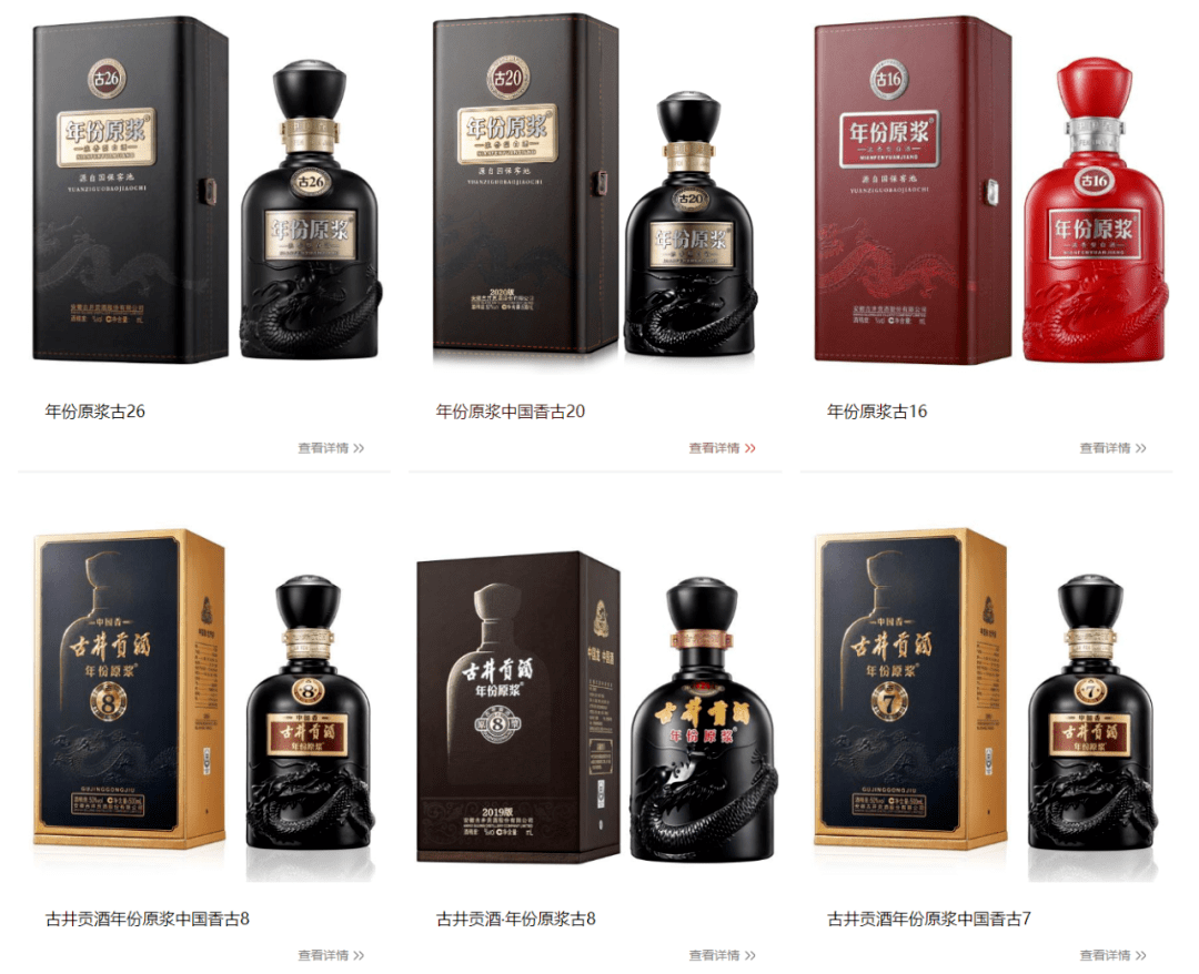 古井贡酒主打产品就是“年份原浆”系列酒,这一系列产品占古井贡酒总营收比例高达75%以上,是毫无疑问的主力产品。官网显示,古井贡酒年份原浆系列包含“年份原浆古5”“年份原浆古7”“年份原浆古8”“年份原浆古20”“年份原浆古16”“年份原浆古26”等多个单品。