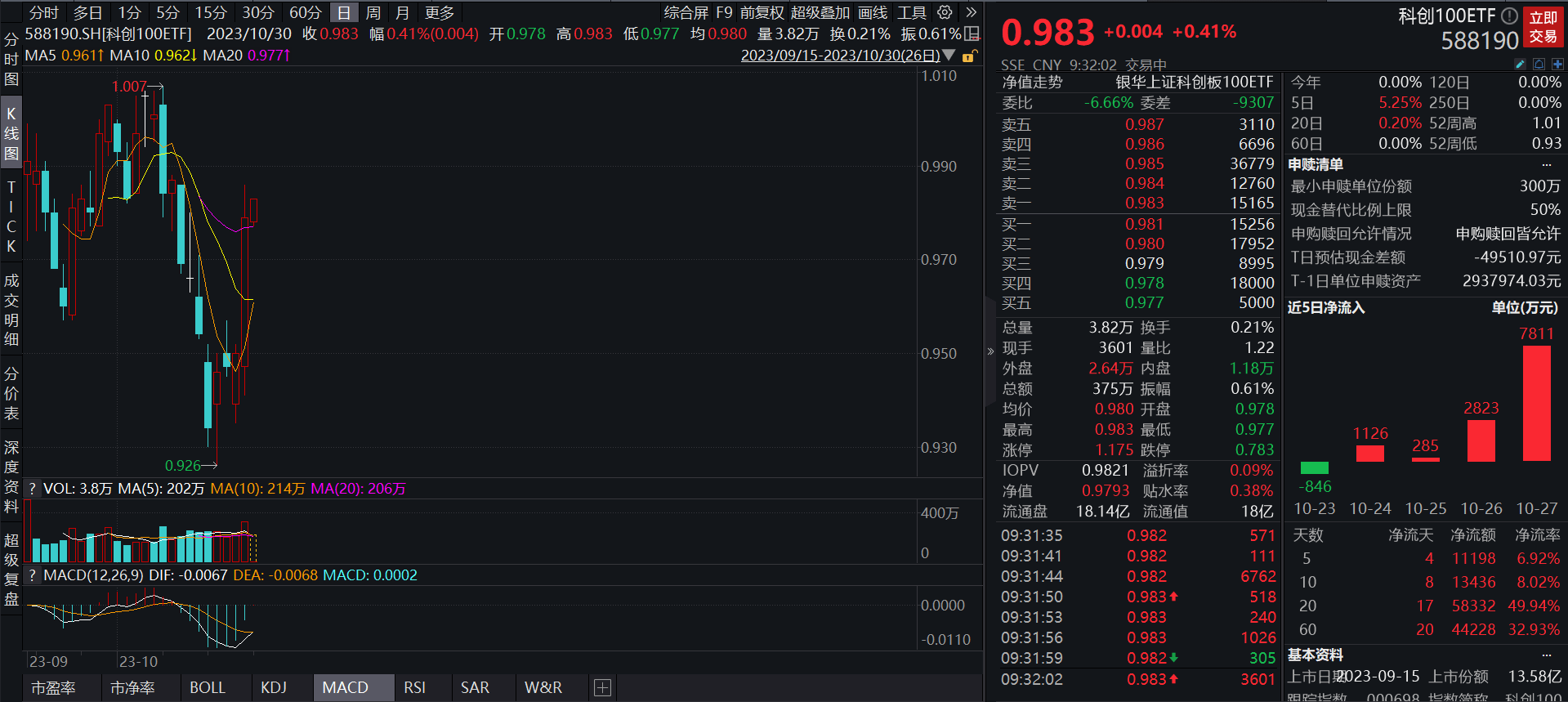 截至2023年10月30日9:32,科创100ETF(588190)开盘快速拉升,已涨0.41%,报0.983元,成交额不断扩大,市场交投活跃。Wind数据显示,该基金已连续4日获资金净流入,累计超亿元。