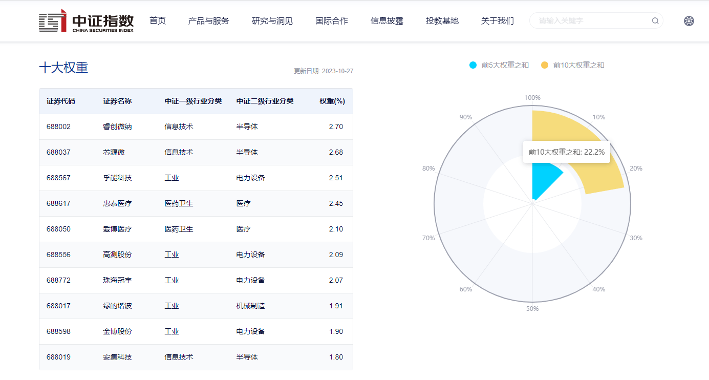 数据显示,截至2023年10月27日,该指数前十大权重股包括睿创微纳、芯源微、孚能科技、惠泰医疗、爱博医疗等,前十大权重股合计占比约为22.2%。(数据来源:中证指数公司,指数成份股不代表个股推荐)