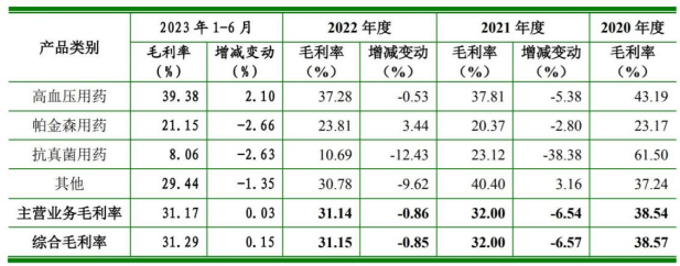 招股书显示,报告期内野风药业的主营业务毛利率分别为38.54%、32%、31.14%和31.17%,综合毛利率分别为38.57%、32%、31.15%和31.29%;期内分别减少了7.37个百分点和7.28个百分点。