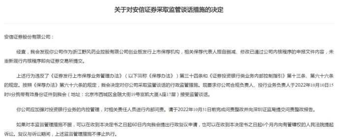 尤为注意的是,野风药业的保荐机构安信证券及签字保荐代表人曾因擅自删改文件内容被罚。2022年6月野风药业主动撤回IPO文件,三个多月后,2022年9月30日,证监会对安信证券下发行政监管措施。