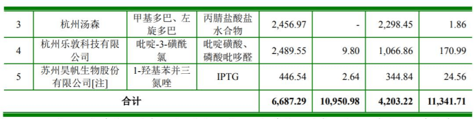 与此同时,山东泓瑞也是公司客户,重叠客户、供应商还包括丽水市金马生物科技有限公司、杭州汤森、杭州乐敦科技有限公司和苏州昊帆生物股份有限公司,报告期内公司向上述重叠客户、供应商销售金额合计分别为4203.22万元、6687.29万元、4703.62万元和2773万元,采购金额合计分别为1.13亿元、1.10亿元、1.13亿元和4911.01万元。