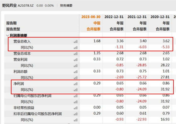 2020年—2023年上半年(以下简称:报告期),野风药业的营业收入分别为3.62亿元、3.40亿元、3.36亿元和1.68亿元,同期净利润分别为0.86亿元、0.66亿元、0.65亿元和0.29亿元;其中2020年—2022年,公司营收分别同比下降5.33%、6.03%和1.31%,2021年和2022年净利润同比下降24.09%和0.80%。