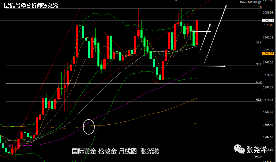 虽然仍有2000关口和历史高点一线的强劲压力而展开持续回落的风险,但根据60月均线和100月均线形成的金叉中长期看涨来看,本月的低点也几近中长期触底,所以如有再度走低回落,5-10月均线,以及1800美元附近或者是其下方,也都是再度入场中长线看涨的机会。