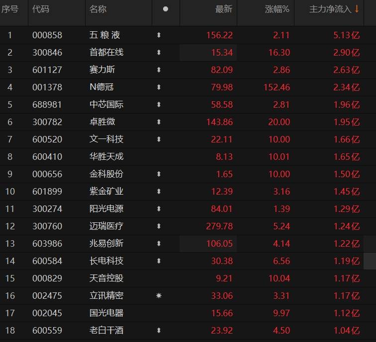 原标题:18只A股主力资金净流入超1亿元 五粮液净流入超5亿元居首