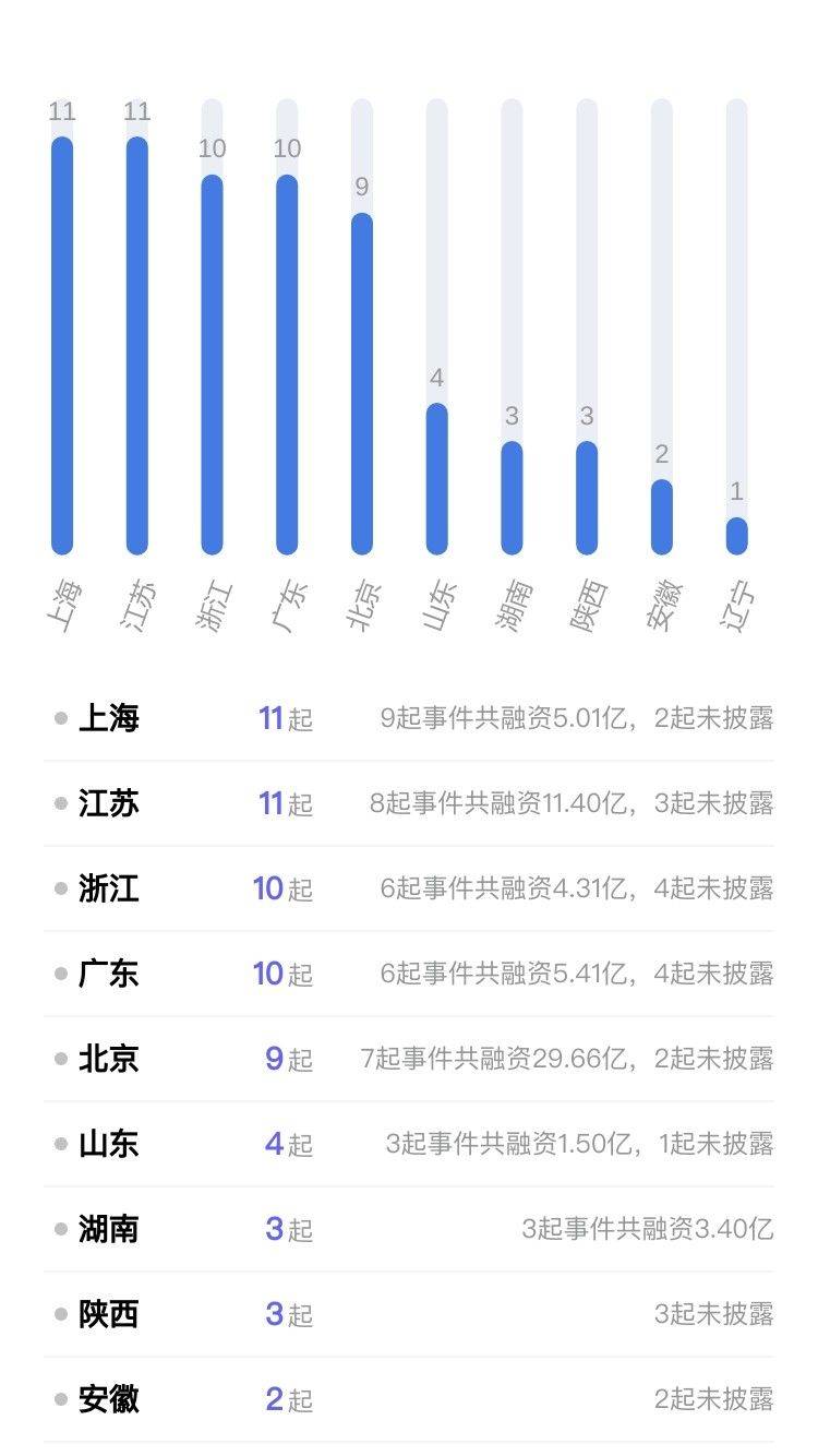 从本周披露获投企业的地区分布来看,主要集中在上海、江苏、浙江。其中上海披露11个,江苏披露11个,浙江披露10个。