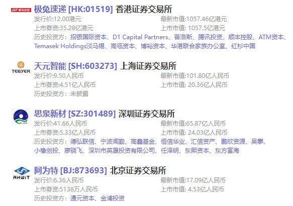 4家上市公司中,有3家曾获VC/PE或CVC投资,其中「极兔速递」曾获红杉中国、腾讯投资、高瓴资本投资;「思泉新材」曾获东方富海、恒信华业、东煕资本投资;「阿为特」曾获金浦投资、通元资本投资。