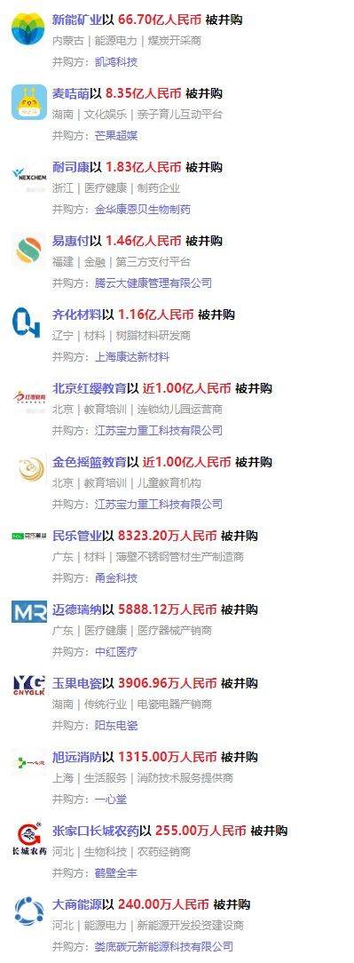 本周国内披露已完成的并购事件14个,与上周相比增加2个,分布在传统行业、能源电力、医疗健康行业。其中,凯鸿科技以66.70亿人民币收购煤炭开采商新能矿业100%股份。被收购方新能矿业隶属新奥集团,成立于2008年,位于内蒙古自治区鄂尔多斯市,是一家煤炭开采和洗选服务提供商,致力于高科技现代化矿井的建设和高品位煤炭的生产。