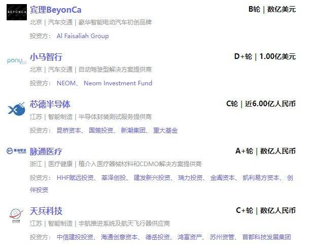 其次是智能制造行业,已披露融资总额为12.50亿元人民币。其中半导体封装测试服务提供商 「芯德半导体」 获近6.00亿人民币C轮融资。