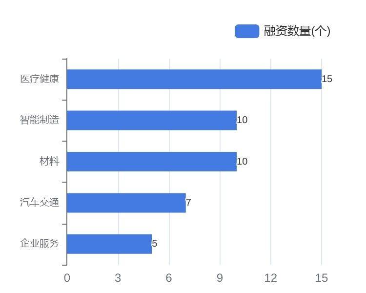 从融资事件数量来看,本周医疗健康、智能制造、材料领域融资最活跃。分别为医疗健康15个、智能制造10个、材料10个。