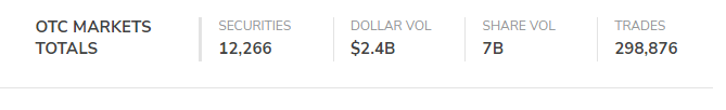 OTC市场是可以进行交易的,在OTC pink板块挂牌的企业主要是采用做市商报价交易方式。每一家公司在完成相应监管要求进行信息披露后,可以委托一家或多家做市商为其报价。根据OTC官网的数据,美股OTC所有市场交易数额都较大。