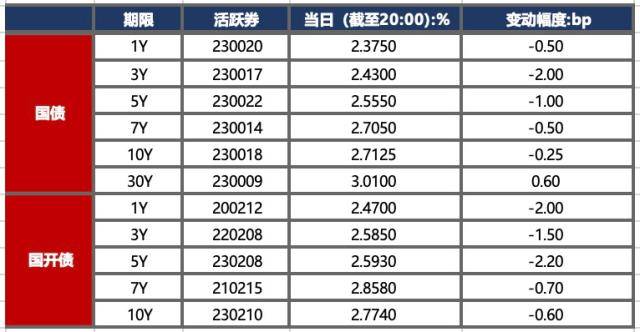 10月27日,资金面延续向宽提振债市情绪,银行间主要利率债收益率多数下行,但同业存单价格持续高位抑制收益率下行空间,同时万亿国债供给压力使超长券疲软。截至北京时间20:00,10年期国债活跃券230018收益率下行0.25bps至2.7125%;10年期国开债活跃券230210收益率下行0.60bps至2.7740%。