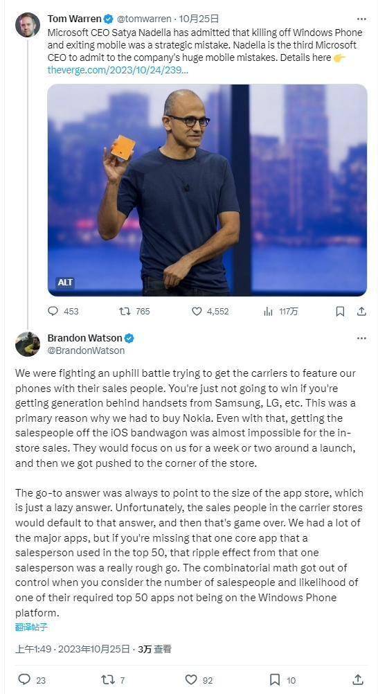 10月28日消息,在微软首席执行官纳德拉承认杀死 Windows Phone 是错误决定之后,一位微软前高管从另一个视角,解读了微软真正杀死 WP 的原因。Windows Phone 开发者体验部前负责人布兰登・沃森(Brandon Watson)在?(推特)上发言,认为导致 WP 系统衰落的重要原因之一是运营商缺乏兴趣。