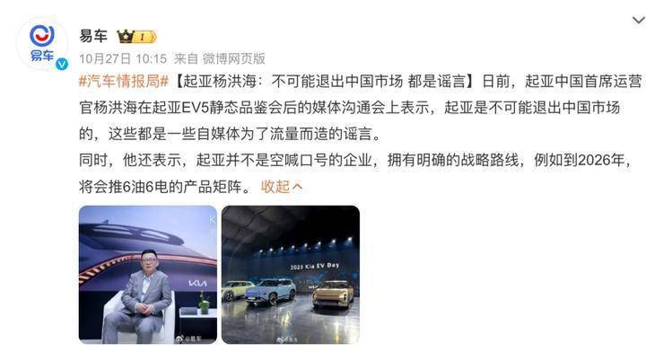 日前,起亚中国首席运营官杨洪海在起亚EV5静态品鉴会后的媒体沟通会上表示,起亚是不可能退出中国市场的,这些都是一些自媒体为了流量而造的谣言。整个中国的研发团队为了EV5这款全球车型付出了艰辛的努力,我们将坚定的推进EV电动化的路线。
