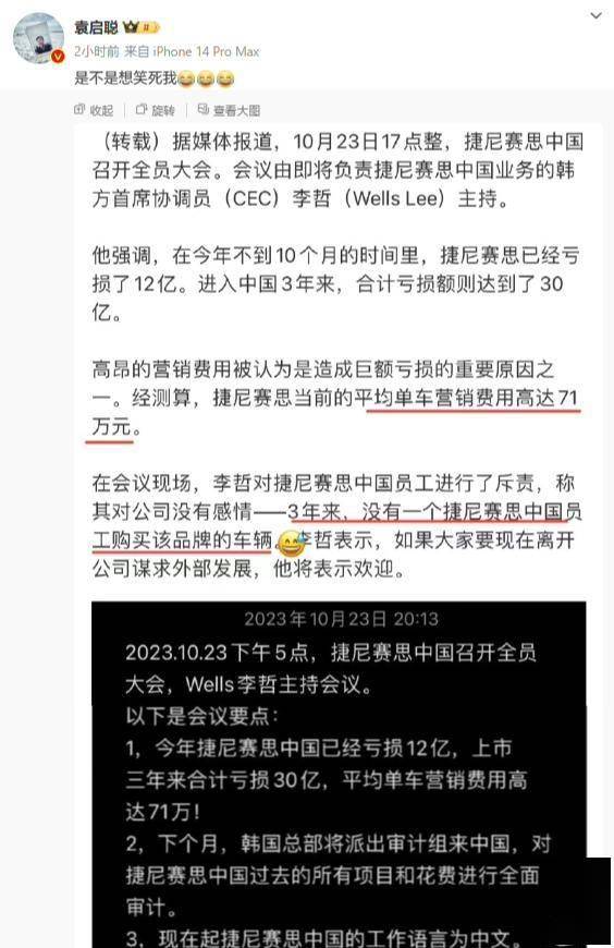 李哲还称员工“对公司没有感情”:3 年以来,没有一个捷尼赛思中国员工购买该品牌的车辆。同时,他还放话“若大家现在离开公司谋求外部发展,将表示欢迎”。(IT之家)