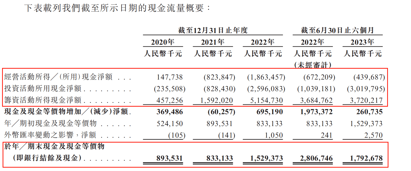 招股说明书显示,2020-2023年6月底,龙蟠科技仅有2020年经营性现金流净流入1.48亿元,之后的年份,经营性净现金流均为净流出,近3年半合计净流出29.79亿元,说明龙蟠科技自身并没有完整的造血功能。