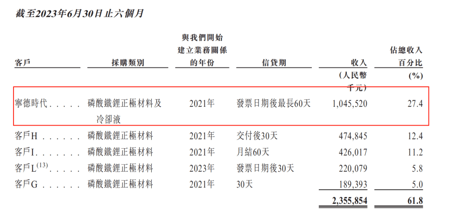龙蟠科技和湖南裕能一样,都很依赖像宁德时代(300750.SZ)这样的大客户,2023年上半年,前五大客户业务占比达到了61.8%,其中宁德时代就占到了27.4%。