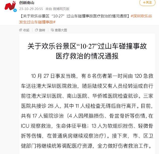 10月29日晚间,深圳市南山区委(区政府)官方微博发布《关于欢乐谷景区“10·27”过山车碰撞事故医疗救治的情况通报》。
