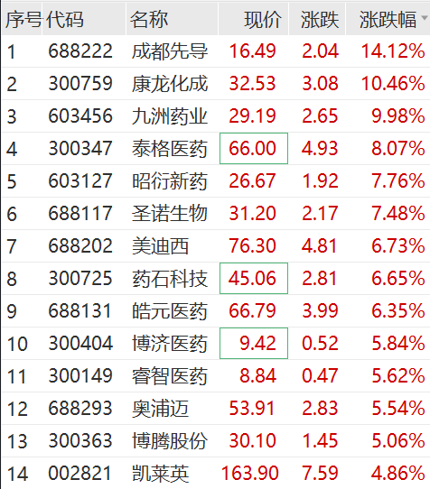 个股方面,九洲药业、润达医疗、誉衡药业等涨停,普利制药、健帆生物、成都先导等多股涨超10%。